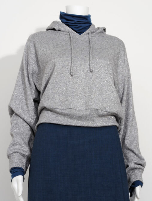 Glitzer-Hoodie aus Viskose/Lurex € 200, Rolli aus Viskose € 120, Rock aus Cool Wool € 210