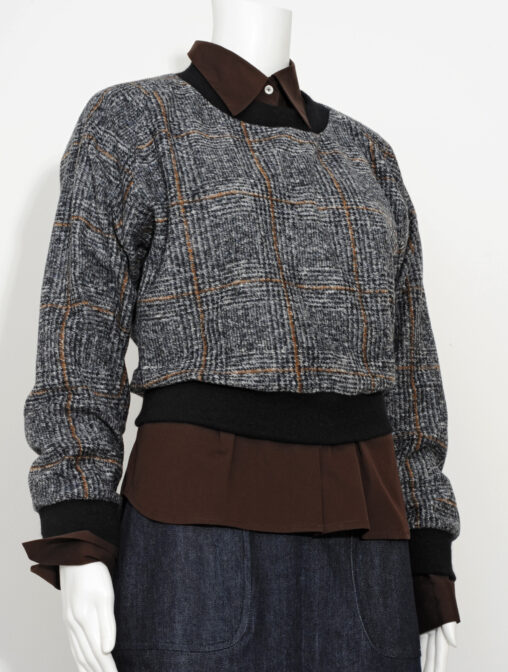 Sweater aus Wolljersey € 180, Bluse aus Baumwolle € 190, Rock aus Denim € 210