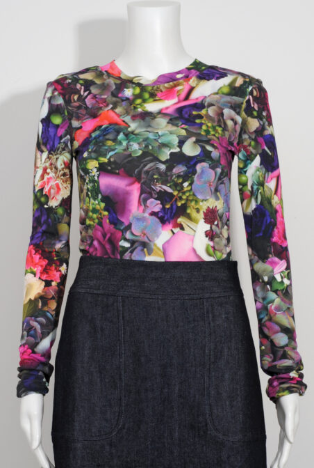Longsleeve aus Seide/Viskose € 110, Rock aus Denim € 210